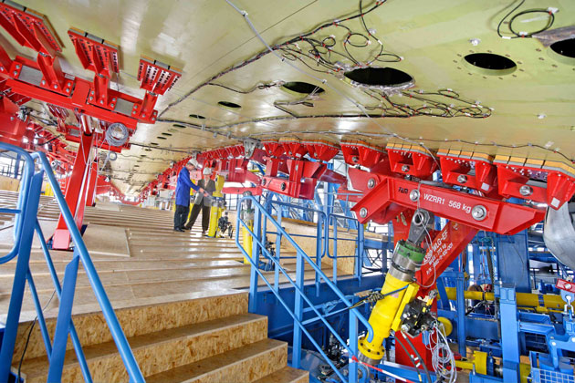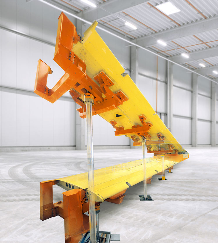 Los requisitos de precisión hacen necesario evitar fuerzas perturbadoras, como por ejemplo, los efectos stick-slip de los cilindros. En las puntas de las alas, por ejemplo, se producen fuerzas de recuperación muy bajas, pero al mismo tiempo deben moverse hasta 670 mm/s. En este proceso, las alas se mueven hasta 2,9 m desde la posición cero hacia arriba y hasta 1,2 m hacia abajo. Sin embargo, pueden producirse fácilmente vibraciones no deseadas de las estructuras blandas si los pistones y los vástagos de los cilindros hidráulicos no son lo más suaves posible. Aquí se aceptan tolerancias de solo el 3 por ciento de la carga nominal del cilindro, en la práctica estas se sitúan por debajo del 2 por ciento. Las vibraciones no deseadas provocarían desviaciones de carga no deseadas y falsearían los resultados de las pruebas. Los cilindros hidráulicos con el cierre por estrangulación en cono flotante patentado por Hänchen se utilizan especialmente en las pruebas de estructura de aviones, ya que siempre tienen la misma fricción, independientemente de la presión. En ellos, un casquillo de acero se deforma a través de una rendija reducida y crea así un espacio de junta sin contacto de pocos 1/100 mm. El requisito previo para esta tecnología es una precisión de producción en el rango de pocos μm, ya que de lo contrario la fuga provocaría elevadas pérdidas hidráulicas. Esta serie de cilindros 320 en ejecución Servofloat® ofrece una ventaja de costes de alrededor del 30% en comparación con los cilindros con guía de vástago hidrostática. Los cilindros de prueba de Hänchen ofrecen la posibilidad de una precisión de posicionamiento y repetición muy elevadas gracias a su muy baja fricción, están libres de stick-slip y son igualmente adecuados para movimientos extremadamente lentos y rápidos. Sin embargo, la estabilidad también fue un factor decisivo en la selección de los cilindros hidráulicos de Hänchen. Al fin y al cabo, la prueba se realiza las 24 horas del día, los siete días de la semana.