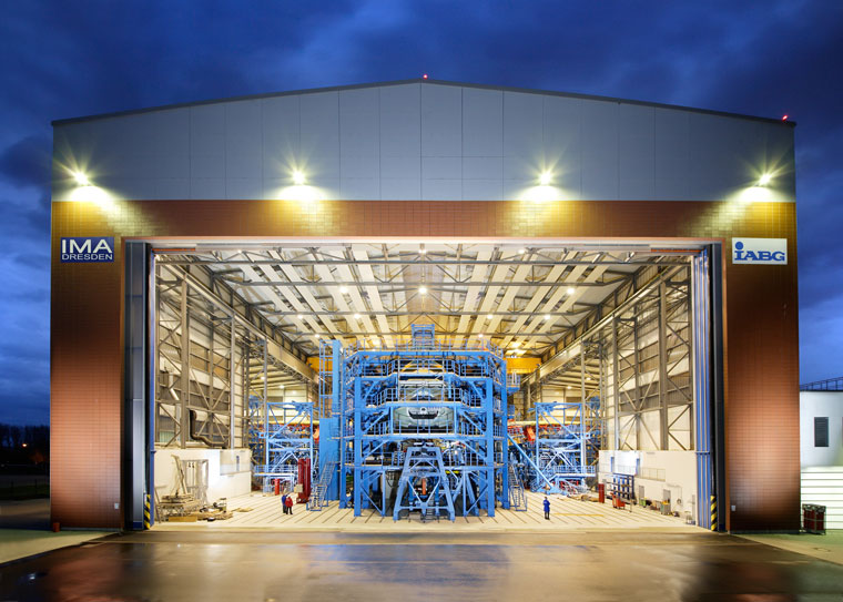 94 cilindros de prueba Hydropuls de Hänchen mueven el avión en el banco de pruebas de materiales. Son el componente mecánico central de una prueba a cámara rápida. Mediante la prueba a cámara rápida, se simulan en un plazo de 18 meses las secuencias de movimiento de toda la vida útil de un avión de 25 a 30 años. Este Airbus realizará al menos 35.000 vuelos en el banco de pruebas, y nunca saldrá del pabellón situado justo al lado del aeropuerto de Dresde.