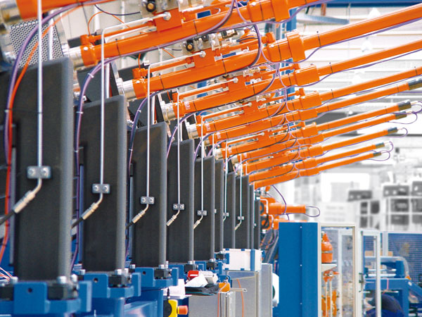 Así, en la prueba de los flaps y los alerones del A350 XWB se utilizan 26 cilindros, exclusivamente de Hänchen. La hidráulica es especialmente adecuada aquí debido al tamaño de los actuadores, la densidad de potencia, la calidad de regulación y la dinámica, para poder simular de forma óptima las condiciones de vuelo. La desviación de regulación admisible del 1 % con carga estática se cumple gracias a los cilindros hidráulicos de Hänchen. En las pruebas dinámicas, la desviación de regulación admisible es del 4 %. El banco de pruebas está diseñado para una duración de entre 15 y 20 años. Las excepciones son las herramientas especiales para la investigación de situaciones extremas, que están diseñadas para ciclos de carga limitados en condiciones de carga máxima.