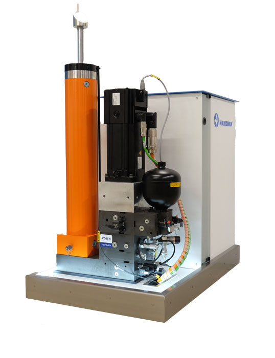 El nombre CLDP significa 'Closed Loop Differential Pump' de Voith en Rutesheim y es un servoaccionamiento con bomba integrada. Por lo tanto, este accionamiento hidráulico solo debe conectarse mecánica, eléctrica y electrónicamente y luego funciona sin necesidad de mantenimiento durante un período de 3 años o 20.000 horas. Voith suministra el paquete completo, cuyo elemento de accionamiento utiliza un cilindro hidráulico de Herbert Hänchen GmbH. Esto permite tanto al usuario como al fabricante de máquinas e instalaciones utilizar un sistema hidráulico de alto rendimiento sin necesidad de conocimientos hidráulicos propios, y esto en un sistema sin válvulas con una eficiencia óptima. “Especialmente con grandes fuerzas, el cilindro hidráulico es claramente superior al accionamiento por husillo. Además de la manipulación más sencilla de grandes fuerzas, tiene un desgaste considerablemente menor”, explica el ingeniero Harald Branz, jefe de ventas responsable del proyecto en Voith. “Y gracias a la construcción sin válvulas, se consigue una eficiencia energética inigualable”. Sin embargo, muchos clientes hoy en día rehúyen la hidráulica porque ya no tienen sus propios especialistas. Sin embargo, la relación coste-beneficio y la alta densidad de fuerza de esta tecnología siguen siendo inigualables. El CLDP es un dispositivo de alto rendimiento que el cliente puede utilizar sin necesidad de conocimientos hidráulicos propios.