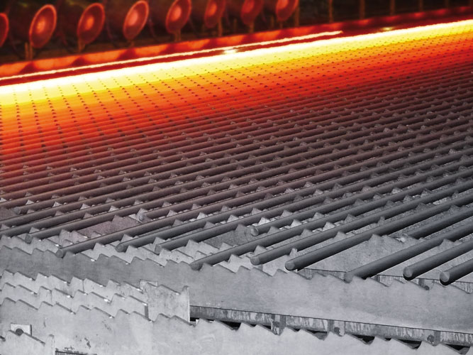 A 12 m/s, los vástagos de acero al rojo vivo salen del bloque de laminación de la acerería de Georgsmarienhütte hacia el lecho de enfriamiento. Una cizalla de arranque y parada corta los cordones de laminación a la longitud del lecho de enfriamiento. El proceso de frenado y transferencia de las barras laminadas desde la dirección longitudinal al transporte transversal del lecho de enfriamiento se realiza en la zona de entrada del lecho de enfriamiento mediante desviadores, dispositivos de separación y el corredero de frenado.