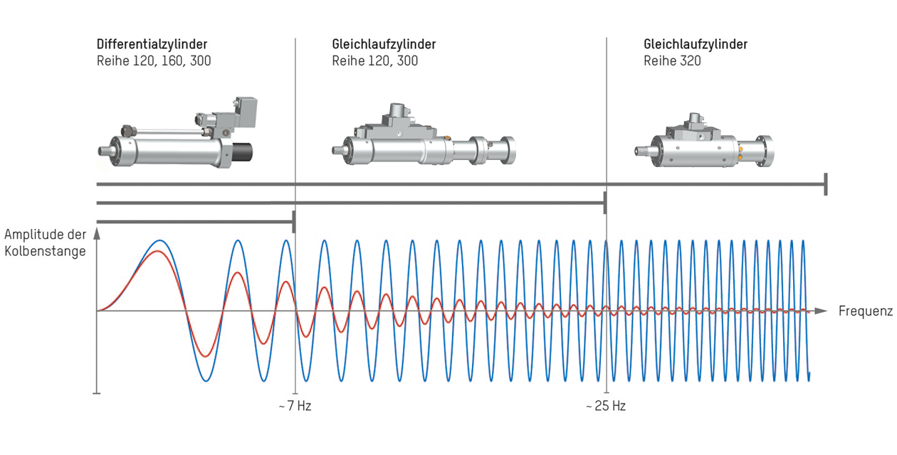 La dinámica requerida del accionamiento determina el tipo de efecto del cilindro. Con válvulas de regulación rápidas, incluso los cilindros diferenciales alcanzan una alta calidad de perfil a altas frecuencias.
