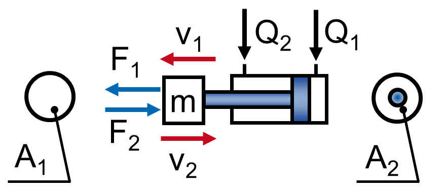 | Fórmulas para el cálculo de cilindros hidráulicos | Cilindro simple vástago A2 < A1 |
