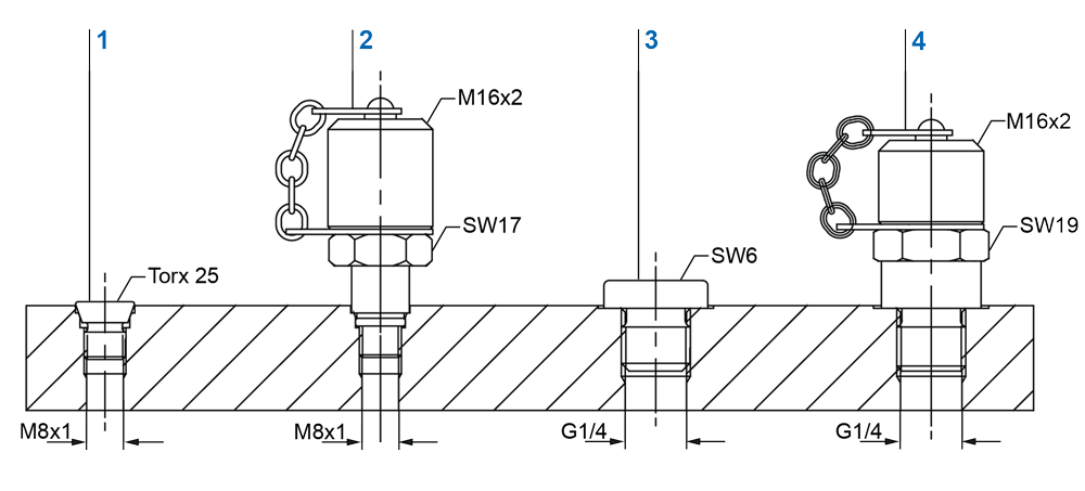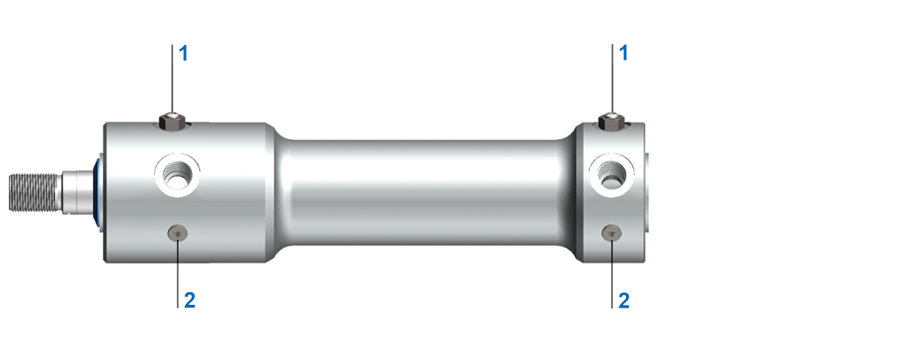 Los cilindros hidráulicos y multiplicadores de presión se suministran generalmente con tornillos de purga en ambos lados. Los orificios de purga son adecuados para conexiones de toma de medición.